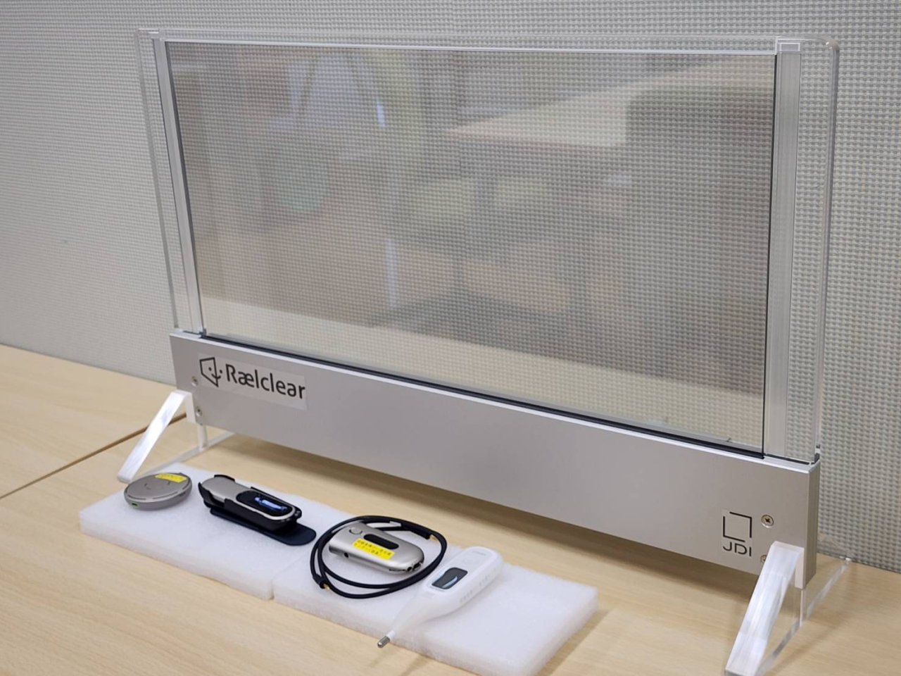 対面会話の際に設置し、PC等から入力された音声が文字起こしシステムを通してテキスト化され、透明ディスプレイに表示されます。